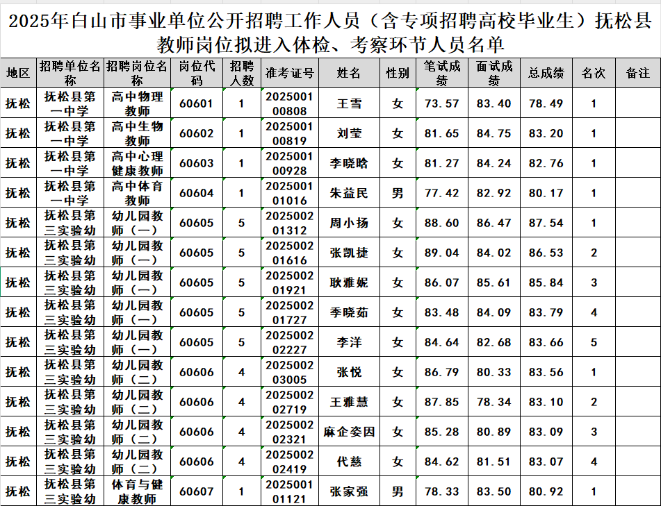 现将2025年白山市事业单位公开招聘工作人员(含专项招聘高校毕业生)抚松县教师岗位拟进入体检、考察环节人员及其成绩面向社会公示,欢迎考生和社会各界广泛监督。